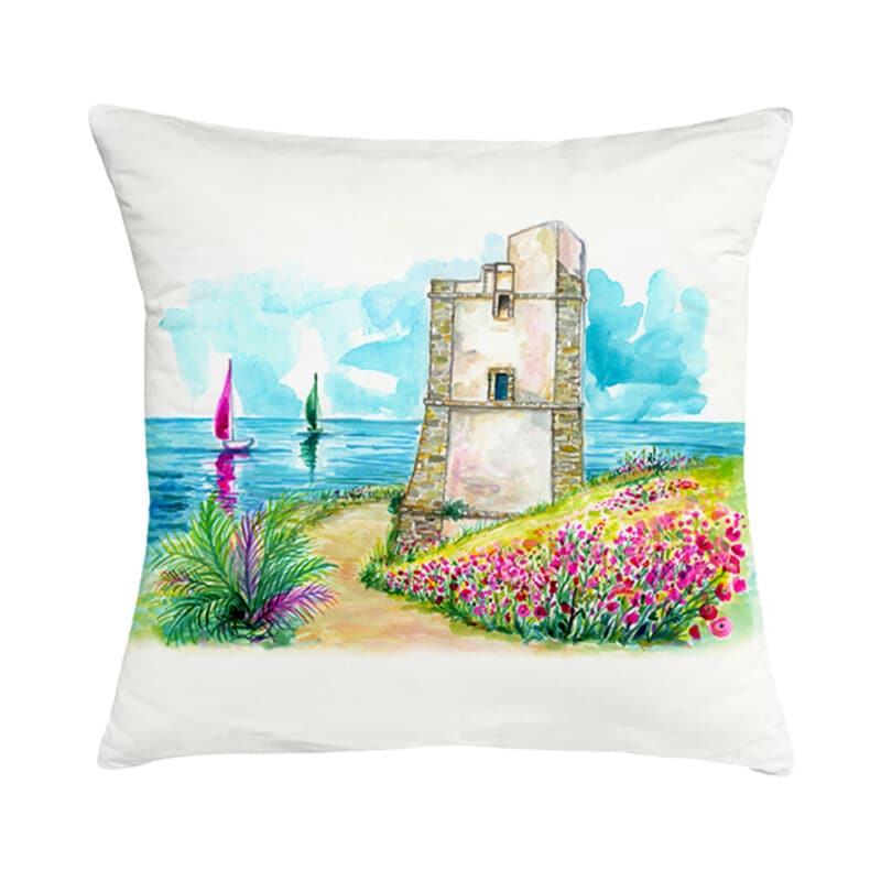 Il Cuscino Torre Saracena coniuga la morbidezza del cotone con la vivacità dei colori con eleganza e originalità .
