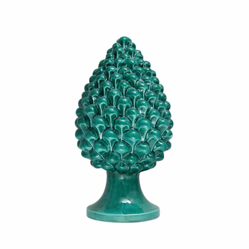 La pigna Verde Siciliano, alta 30 cm, celebra la natura mediterranea e la tradizione siciliana con il suo colore tipico. Realizzata a mano a Caltagirone, è simbolo di vita e buon augurio. Perfetta come centro decorativo per ambienti ampi o per essere regalata ad un evento speciale.