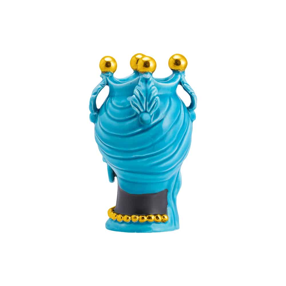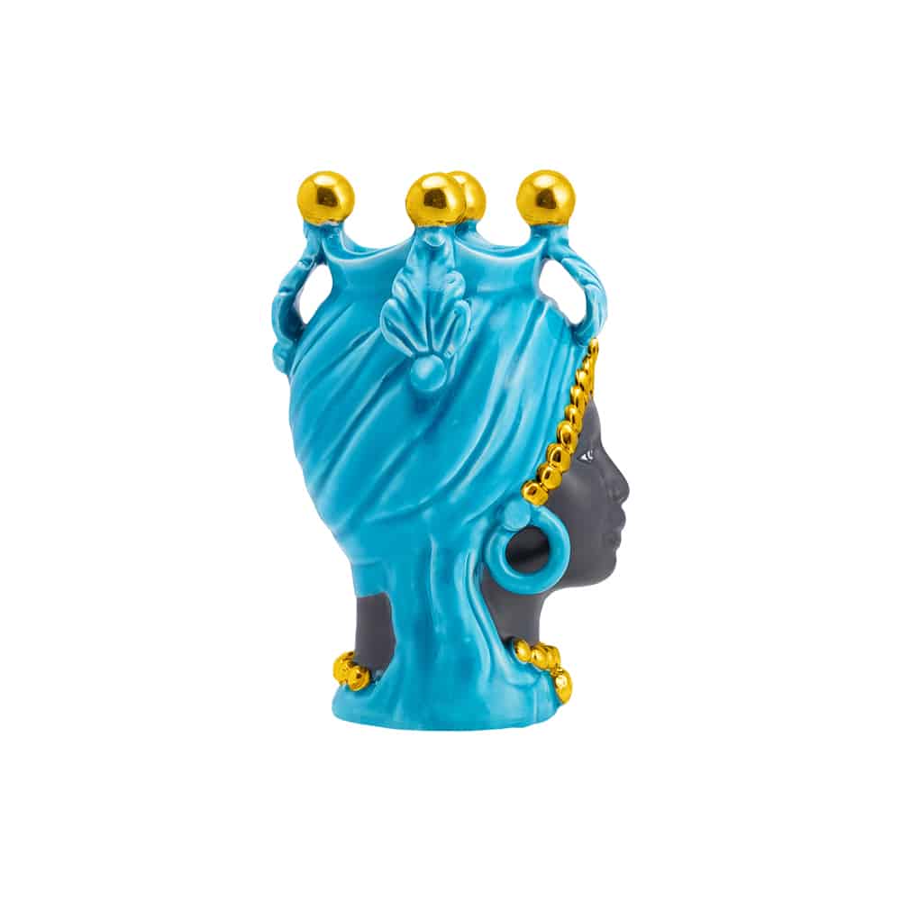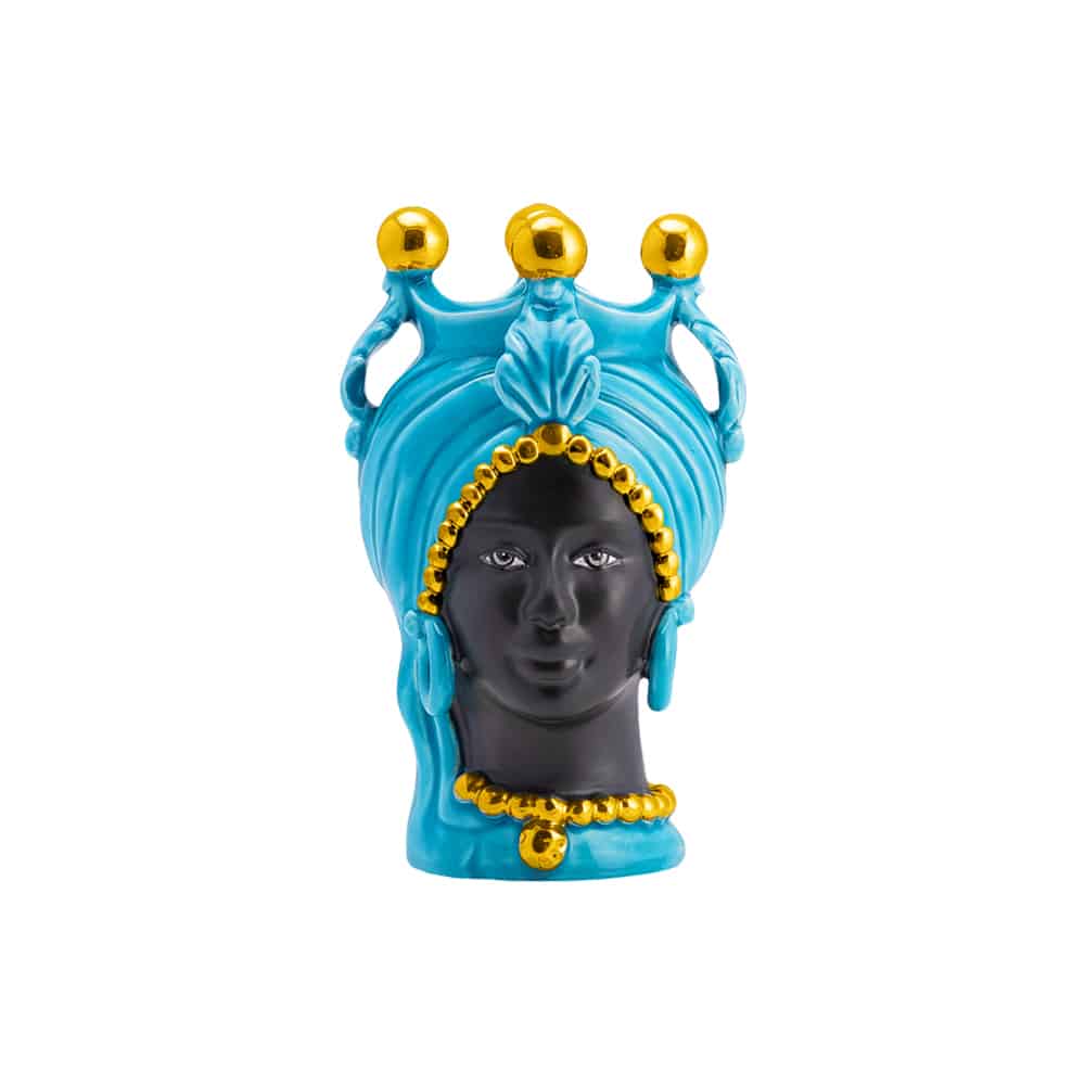La testa di moro Ero in azzurro cielo e oro S, con volto satinato, è un’ opera in ceramica di Caltagirone lavorata interamente a mano. I lustri in oro illuminano i dettagli del copricapo e dei gioielli. La nuance luminosa richiama i colori del Mediterraneo donando freschezza e armonia agli spazi. Un capolavoro artigianale perfetto per ambienti eleganti e contemporanei.
