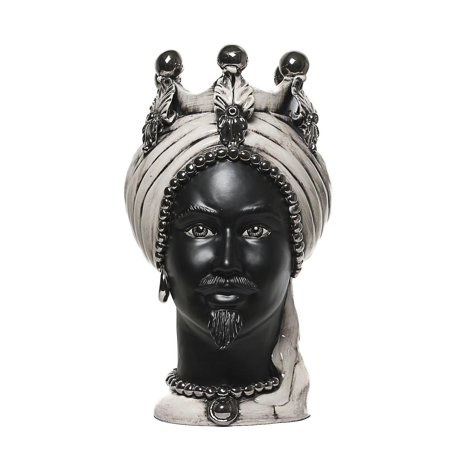 Immergiti nell’eleganza e nella storia con la nostra Testa di Moro Leandro: un’autentica opera d’arte realizzata a mano dai nostri maestri artigiani a Caltagirone. Questa particolare testa in argilla bianca, alta 43 cm, grazie al suo volto nero satinato accompagnato da un turbante grigio fumè e ai dettagli in platino, aggiunge un tocco di lusso e prestigio a qualsiasi ambiente.