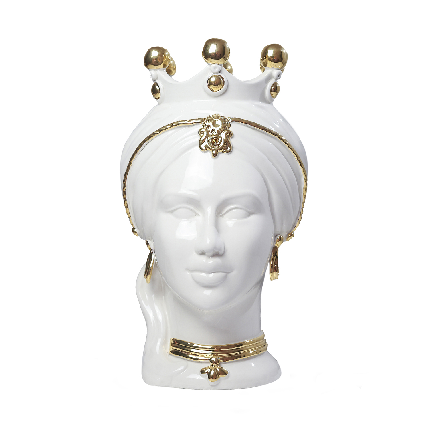 La Testa di Moro Psiche Bianco e Oro L รจ un capolavoro artigianale in ceramica. Modellata a mano dai maestri di Caltagirone, i suoi dettagli in oro valorizzano le linee femminili e conferiscono unโeleganza sofisticata, rendendo ogni pezzo unico. Simbolo della leggenda siciliana, arricchisce ogni ambiente con stile e storia. Perfetta per interni moderni o classici.
