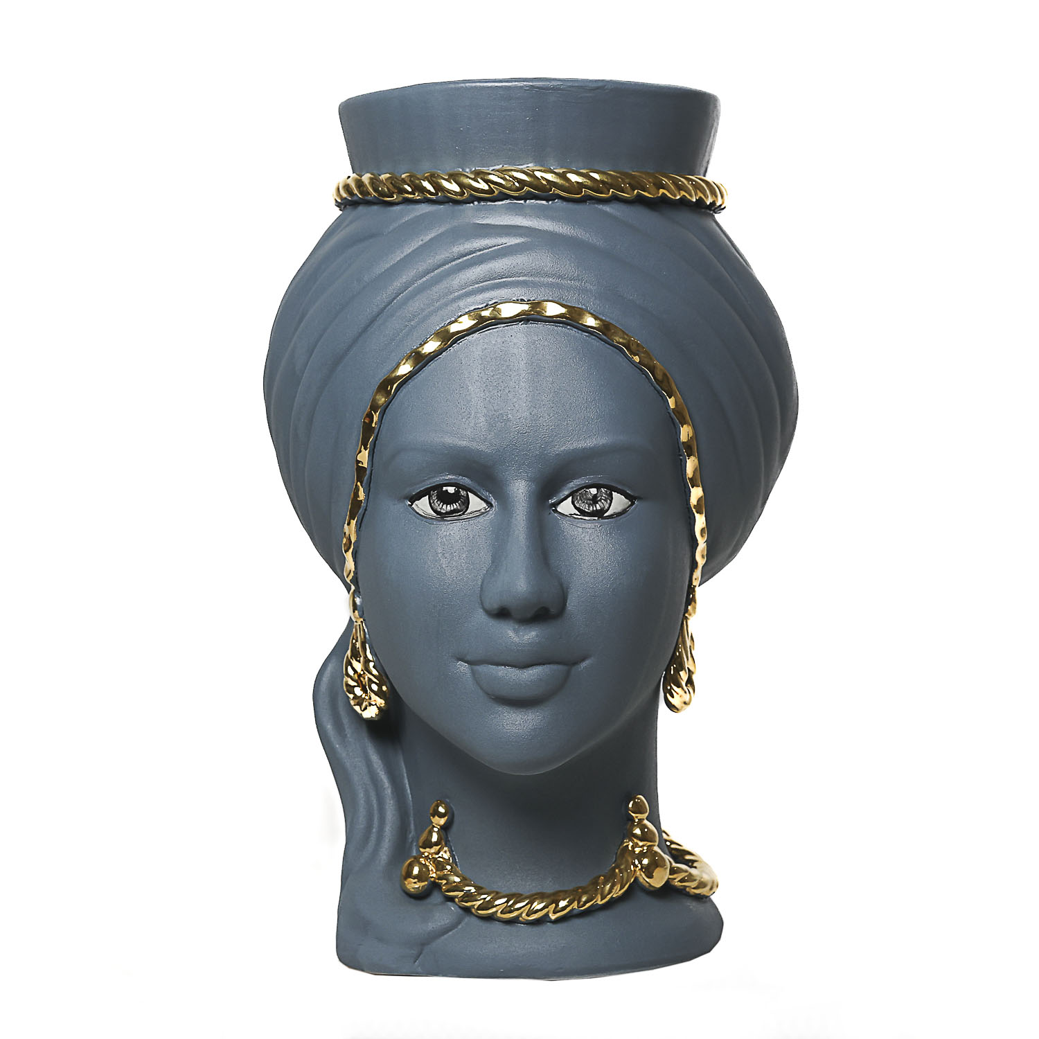 Immergiti nell’eleganza e nella storia con la nostra Testa di Moro Selene: un’autentica opera d’arte realizzata a mano dai nostri maestri artigiani a Caltagirone. Questa particolare testa in argilla bianca, alta 43 cm, grazie al suo colore avion materico e ai dettagli in oro, aggiunge un tocco di lusso e prestigio a qualsiasi ambiente.